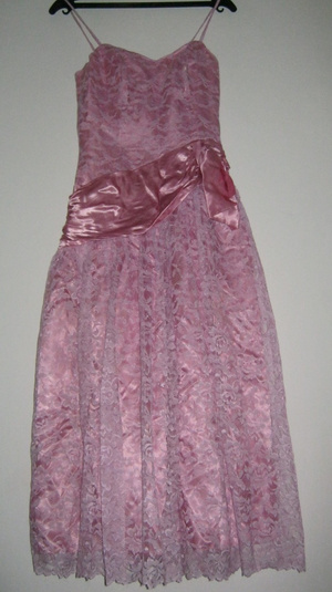 2) Розовое, сверху гипюр, верх на косточках, (на фото-не глажено, если погладить, попышнее будет)), длина по переду~ 110 см, от талии~ 85 см, сзади замок, б/у; размер- 42, может,- 44, ушить можно до 40-го; состояние хорошее. Цена 300 руб.