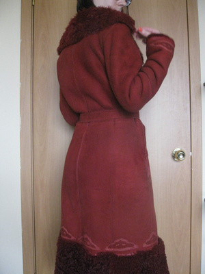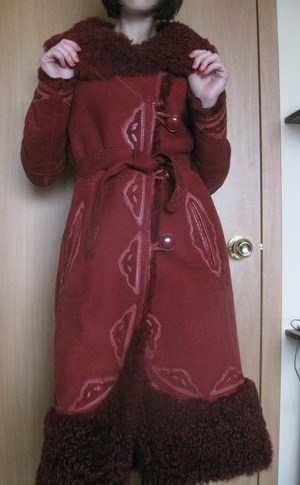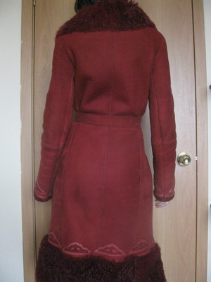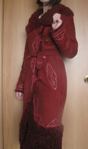 Цвет бордово-красный, очень классический (несколько ярче, чем на фото). Меховой воротник делается глубже.