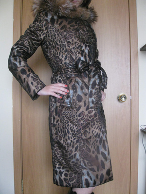 Силуэт полуприлегающий. Капюшон отделан пушниной чернобурка. Рукава и низ изделия присборены. Пояс из кожи (не блестящий), завязывается. Застежка на крючках.