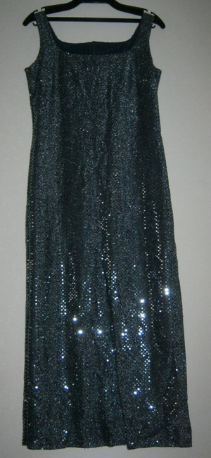3) Блестящее, ткань- люрекс с наклеенными блестяшками, цвет примерно серо-голубой, на подкладе, сзади замок, б/у один раз. Длина~ 122 см, слева разрез- 60 см. Размер~ 44, может 46. Цена 400 руб.