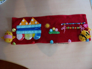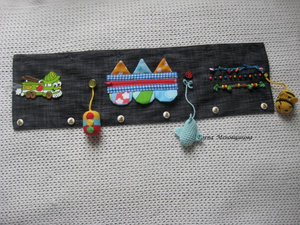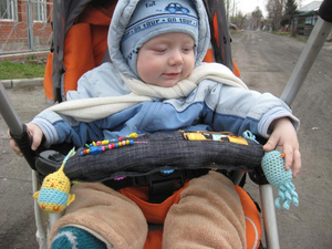 Когда Янику был год, Аля_Априлл сшила своей Тасе развивашку для коляски. Мне понравилась идея и я тоже такой смастерила. Потом моя фантазия поперла дальше и я еще несколько на заказ сшила. Потом я это дело бросила, а так то вообще прикольная штука, одевается на поручень коляски и деть его ковяряет, пока едет.