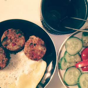 моя: яйцо, овощные биточки, зеленый чай, свежие овощи.