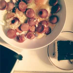 мужа: 4 яйца, 2 сосиски, кофе с сахаром и тортик