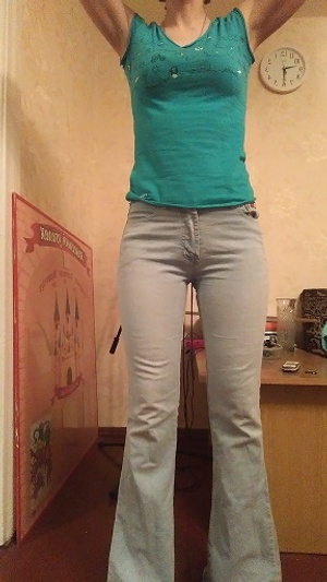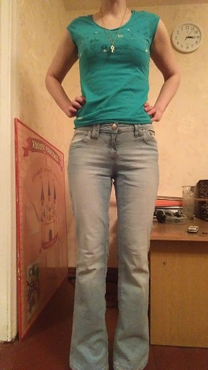 1. Джинсы стрейч, мягкие, тянутся, с потертостями в районе задних карманов и на коленях. На 44 размер. Состояние хорошее. Цена - 150 рублей.