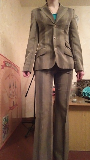 2. Деловой лёгкий костюм-двойка. Пиджак и штаны, размер 42. Состояние отличное, подойдёт на высокую девушку. Цена 350 рублей.