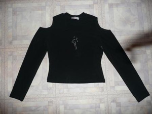 18. Черная шифоновая блузка с завязкой (пуговиц нет, размер регулируется). Рукав 3/4 расклешённый, рюши, завязки. Одета один раз. Р-р. - 42-44. Цена - 100 руб.