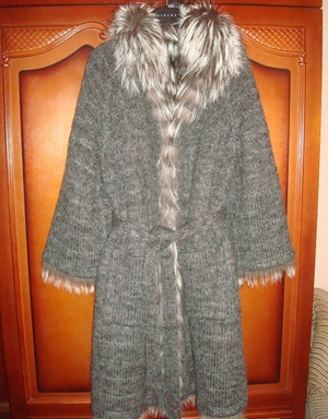Новое 2-стороннее вязаное пальто-кардиган с мехом чернобурки. Застегивается на крючки, 2 накладных кармана со стороны вязки. Мех очень аккуратно пришит полосками, поэтому со стороны вязки ворс не торчит. Очень стильное и элегантное. р. 46-48, цена обсуждаема
