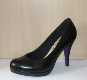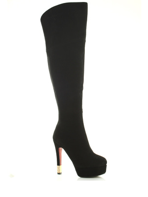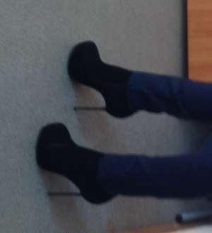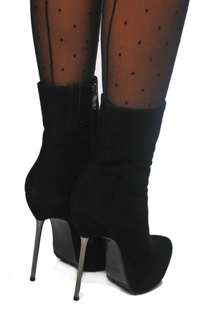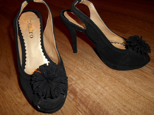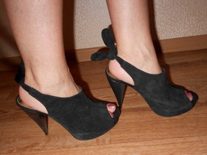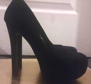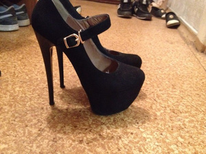Черные под замшу, высота каблука 14 см, высота скрытой платформы 4 см. Размер 39, цена 500 рублей.