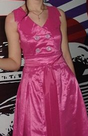 1. Ярко-розовое платье на худенькую девушку, размер 42. Длина по колено.