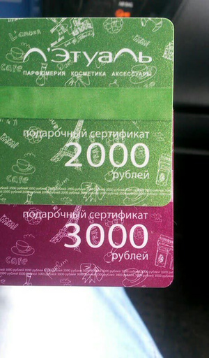 Девочки, добрый день, есть два сертификата, мне не нужны, готова пристроить за 4200, либо сертификат на 2000 за 1600р, сертификат на 3000 за 2600р, обмен не рассматриваю, связь в л/с.