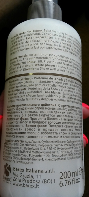 Спрей-бальзам двухфазный Barex (Италия) моментального действия – идеальное средство для ослабленных, ломких, поврежденных волос. Использован раза 3-4 - 600 р.