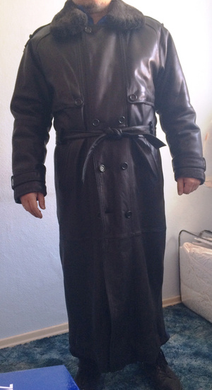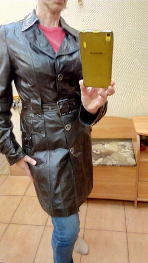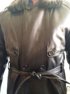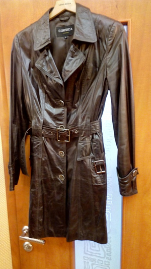 Продам отличный кожаный плащ, практически новый, выгулян два-три раза, стал маловат. Цвет - темный шоколад, размер- на 42 точно как раз будет, на 44 надо мерять, рост до 166. Прошу 4500.