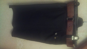 куплена в питер ханн на 50% распродаже за 99 евро, 38 размер, ближе к 44, пояс идет в комплекте (на нем название фирмы), юбка антрацитовая - не черная, впереди пришита имитация перстня. отдам за 80 евро по текущему курсу Альфы, могу принять непосредственно в евро, как налом, так и на р/с.