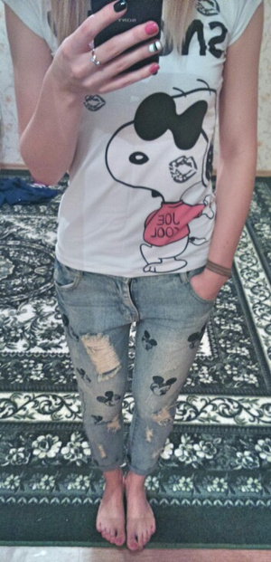 Моднючие Бойфренды с микимаусами, НОВЫЕ!!! (даже петелька под пуговку не прорезана) размер 28, на бедра 93 см. - свободно. Себе оставила потемнее.