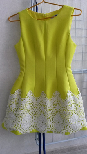 Продам стильное платье колокольчик лимонного цвета(на фото может искажаться) с хлопковым орнаментом по низу.Размер 42, Объем груди-85, объем талии 67, длина изделия 80 см. Хорошо ложиться по фигуре благодаря вытачкам. Новое, не ношено. Цена 1000 руб.