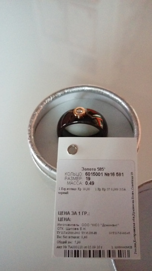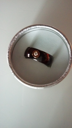 Кольцо из черной керамики, вставка - золото красное 585 +бриллиант Кр 57 0,069 3/5А. Вес вставки - 0,49. Общий вес кольца - 7,99. Ширина шинки - ок 8 мм. Цена - 7500 руб.