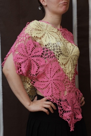 Связано вручную. Розовый в жизни смотрится ярче. Размер примерно до 48-го. На фото надет на девушку 44-го. Отлично носится в любую погоду. В теплую можно надевать на майки-футболки, в холодную - на свитерок-водолазку.