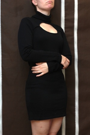 3) платье интересного кроя: передняя часть длиннее задней за счет вставки. Платье черного цвет со вставкой цвета фуксии. Состояние очень хорошее. Размер 2 - подойдет на 42-44. Немного тянется. Комментарий: вертикальная полоска визуально удлиняет силуэт. Цена: 790 руб.