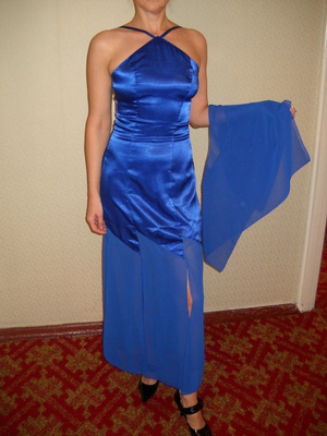 2) красивое синее платье. Б/у один раз (не хотела продавать, но, все-таки, больше не одену). В отличном состоянии. Производство: Корея. Рекомендую на 42-44 размеры. К воротнику пришито украшение. Если не нравится - можно отпороть. При вечернем свете смотрится очень красиво. Застегивается на молнию, которая проходит по спинке. Длина по спинке: 86см.