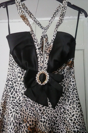 Несмотря на то, что принт леопардовый, вполне уместно появится в нем на выпускном, дне рождении или еще каком-либо мероприятии. Пошив качественный, ткань очень хорошая на вид и на ощупь; платье одето 1 раз, висит в шкафу не один год. Куплено дороже 6 тыс. руб. в Новосибирске в специализированном салоне вечерних платьев несколько лет назад. Таких платьев не найдете. Предлагаю примерить обладательницам размера 40-42 с грудью до 2 размера. Низ платья воздушный и немного объемный за счет оборки, подшитой к подкладу. Смотрится очень красиво. Цена: 3500 руб.