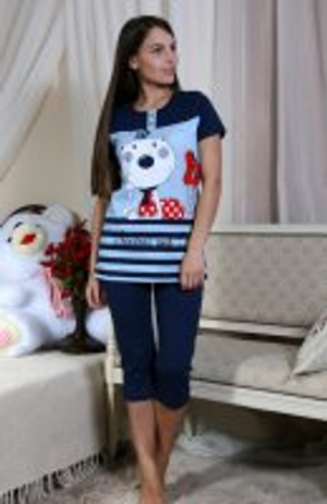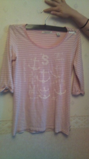 на 44/46, на плече кнопки-сердечки, сам трикотаж в полоску и с якорями, рукав 3/4