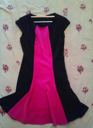 Продам платье интересного кроя: передняя часть длиннее задней за счет вставки. Платье черного цвета со вставкой цвета фуксии. Состояние очень хорошее. Размер 2 - подойдет на 42-44. Немного тянется. Комментарий: вертикальная полоска визуально удлиняет силуэт. Цена: 899 руб.