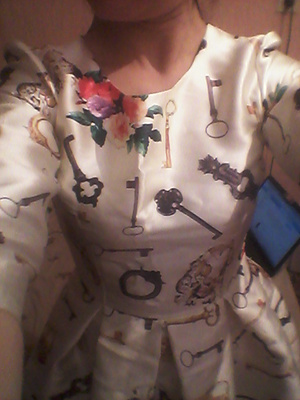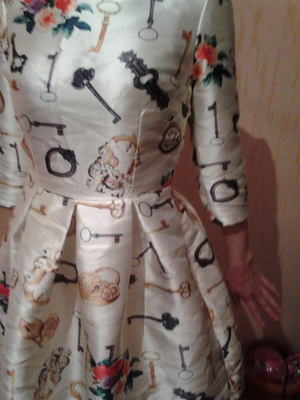 Продам платье. Одела 1 раз и поняла, что не мой стиль. Подойдет на российские 40-42-й размеры. Рукава 3/4. Сшито качественно. Приятная на ощупь ткань - плотная, держит форму, не атлас, не тонкая и не толстая. Нижняя часть платья (юбка) пышная. Основной цвет платья: молочный или жемчужный, яркий принт с ключиками. Замеры: ОГ до 86см., ОТ до 69см., длина по спинке: 90см, обхват рукава: 42см. Продаю намного дешевле, чем приобретала: 1099 руб.
