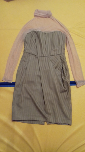Серебряное платье с набивными черными цветами и черной бархатной грудкой теперь по колено.