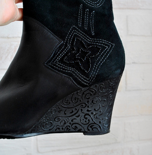 Красивые демисезонные полусапожки с вышивкой из бисера и танкеткой с узором. Размер 40. Высота танкетки 8 см. Одеты были пару раз. Состояние отличное. Колодка удобная. Натуральная кожа. Причина пристроя - не могу ходить на высоком каблуке из-за плоскостопия.