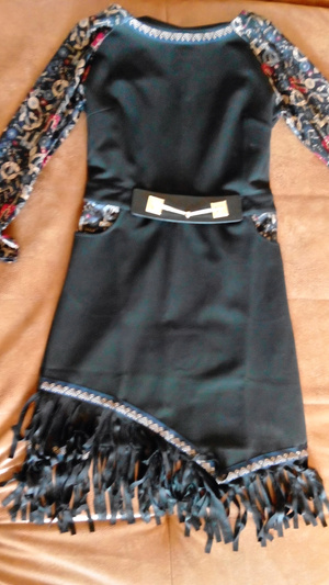 Продам новое платье из плотного трикотажа стрейч, ассиметричный низ оформлен бахромой из спандекса. Размер 44 (на 42 тоже будет неплохо, на 46 только если грудь небольшая). На спинке молния, прекрасно сидит на фигуре. Причина продажи - на мои 157см роста длинновато, а сложный низ (там еще и отделка тесьмой) укорачивать дорого обойдется. Но это издержки заказа через Интернет. Цена - 1800 рублей.
