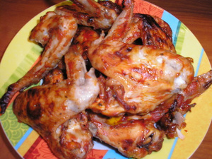 Просто и вкусно. Берем куриные крылышки, моем,сушим, натираем крупной морской солью, всякими травками на вкус, и перцем чили - чуть-чуть! Потом заливаем острым кетчупом (мы берем Хайнц) и на 2-3 часа в холоильник. Потом на противень и в духовку под гриль на 30 минут. Милое дело