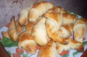 слоеное тесто режу на вытянутые треугольники, на широкий край заворачиваю сыр и ветчину, скручиаю и отравляю в духовку на 15 минут.