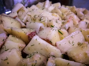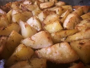 Можно очищенную картошку нарезать крупными кусками, посолить, поперчить, добавить специй по желанию, обвалять в нерафинированном масле и опять же запечт, только уже не на решетке, а ни листе. Такая картошка идет практически ко всему.