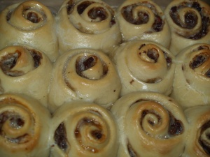в 300 мл. тёплого молока добавляем 7 гр (пачку) сухих дрожжей без добавок, 2 яйца, 3 ст. ложки сахара, 2 ст. ложки соли, 550 грамм просеянной муки высшего сорта, тщательно вымешиваем, добавляем примерно 70 грамм тёплого сливочного масла, вымешиваем, накрываем и ставим в тёплое место на 3 часа. Вымешиваем, накрываем и оставляем ещё на 1 час.