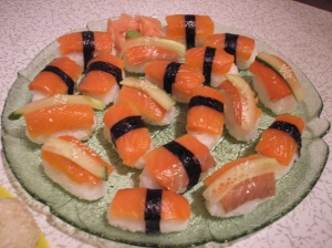 в рисовые шарики я положила кусочек крабовой палочки и огурца