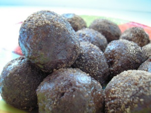 5. Из теплой массы делать шарики и обваливать их в смеси из какао и сахарной пудры или сахара. Шарики у меня плохо лепились, добавила столовую ложку теплой воды - и все получилось.