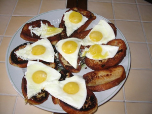 У моих любимый завтрак- обжаренные ломтики батона(вымоченные в молоке и посыпанные солью) а сверху по глазунье.