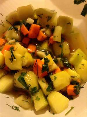 Кабачки кубиками, морковь кубиками, чеснок и зелень порубить. Все перемешать и оставить на три часа или на ночь. Кушать сразу или по банкам и в зиму.