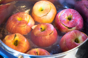 Готовится минут 20. Строгих рекомендаций тут нет, надо смотреть на состояние яблок. Главное, не передержать, иначе могут лопнуть стенки (у меня такая неприятность с парочкой яблок случилась). Как только стенки стали мягкими, можно осторожно вынимать.