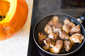 Сначала взял две луковицы, потом добавил третью. Мясо порезал крупными кусками с детский кулак и быстро обжарил до слегка румяной корочки (обжаривал в несколько приёмов, укладывая в тыкву и пересыпая слоями лука, зелени, солью и специями - майоран, орегано, черный перец, зира, паприка).