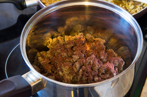 Бараний фарш с луком (посоленный и поперченный) обжариваем на сливочном масле. В процессе приготовления добавляем шафран (я добавил ещё и мускатного ореха), немного сахара и винного уксуса (так в большинстве рецептов, но у меня был из белого вина с эстрагоном).