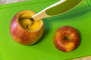 В общем, берём кисловатые яблоки (думаю, идеальна была бы ароматная и крепкая антоновка, но где ж её настоящую взять?). Срезаем верхушки и оставляем в стороне (они у нас будут крышечками). Вырезаем сердцевину яблока, оставляя стенки примерно 0,5 см. (толщина зависит от крепости яблока, если яблоко переспелое и мягковатое, оно может лопнуть в процессе приготовления).