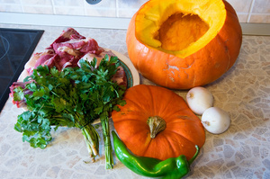 Купил я, как водится, мяса молодого барашка с нежным белым жирком (передок с лопаткой и небольшой задок). Красивую, спелую, оранжевую тыкву кг на 4 или 5 (вес не знаю, бабки продают их поштучно, брал на глаз, не сильно большую, а то в иные и целый баран может уйти).
