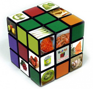 - Берём кубик Рубика, крутим наобум, совпавшие на одной стороне ингредиенты режем, мешаем, заправляем. (таблица соответствия ингредиентов по цветам - в приложенном файле)