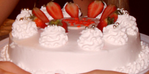 Был под заказ в Кузине, но видимо она совсем загибается и его убрали даже из "под заказ". В нем несколько слоев бисквита, сироп из клубники, два вида сливок(внутри и снаружи).