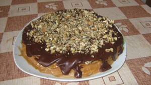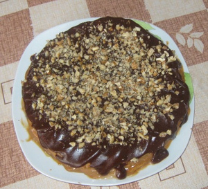 Крем я готовлю заранее, чтобы потом сразу же им обмазывать горячие коржи. Сверху на торт шоколадную глазурь и орехи. Так же можно каждый корж посыпать орехами.