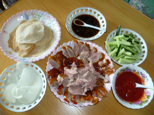 К столу подают готовые лепешки, кусочки утиного мяса (вместе с кожей), соус Хойсин (или сливовый соус) и перышки зеленого лука, из которых делают кисточки (нарезают вдоль на тонкие полоски). Луковой кисточкой смазывают соусом лепешку, сверху укладывают кусочки мяса и саму кисточку, блинчик сворачивают.