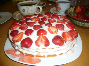 Крем: 1,5 стакана сметаны и 1 стакан сахара. Можно добавить ванилин. Коржи проколоть вилкой, пропитать кремом. На фото мой летний вариант - добавлена свежая клубника.