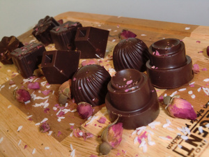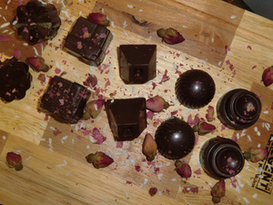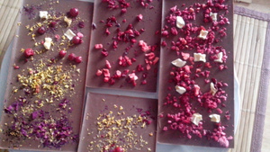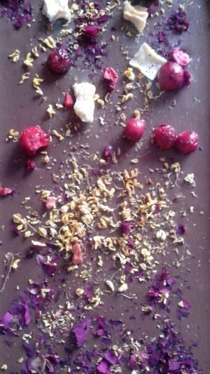 Плитки шоколада (молочный Каллебаут) и темный (Колумбия) 60% с разными вкусами мятой, гвоздикой, розой, и имбирем, сверху сублимированные ягоды - клубника, вишня, манго, малина, засушенная цветы розы, корицы. Получилось очень непривычно по вкусу, особенно с розой