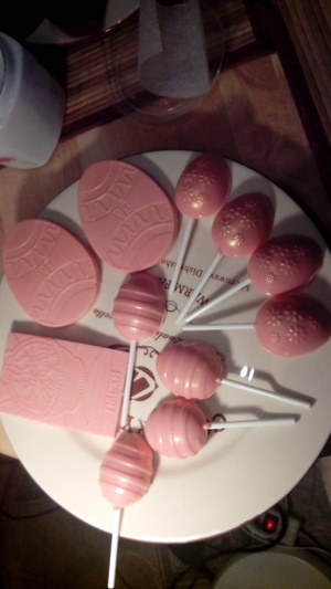 кстати с шоколада трюфели делала, глазурь, надписи....для глазури на глаз разбавляю растопленное КМ и КТ своим сливочным маслом